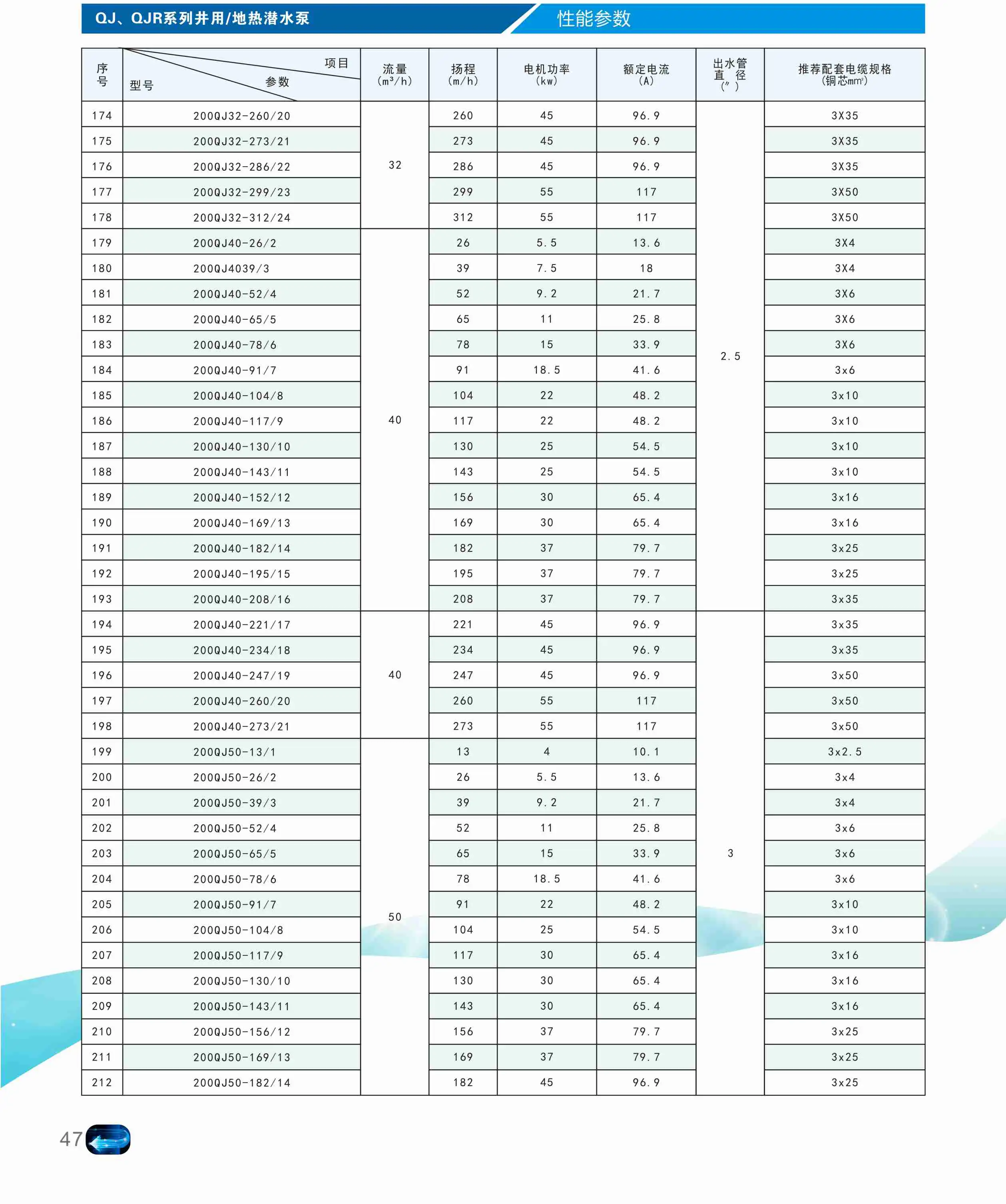 井用潜水泵是深井提水的重要设备,使用时整个机组潜入水中工作,把地下水提取到地表。QJ,QJT 系列产品.是深井提水的重要设备.使用时整个机组潜入水中工作.把地下水提取到地表,是生活用水.矿山抢险.工业冷却.农田灌溉.海水提升.轮船调载.还可用于喷泉景观.热水潜水泵用于温泉洗浴.居民小区利用地热采暖时可作为地热循环泵等,用途十分广泛.