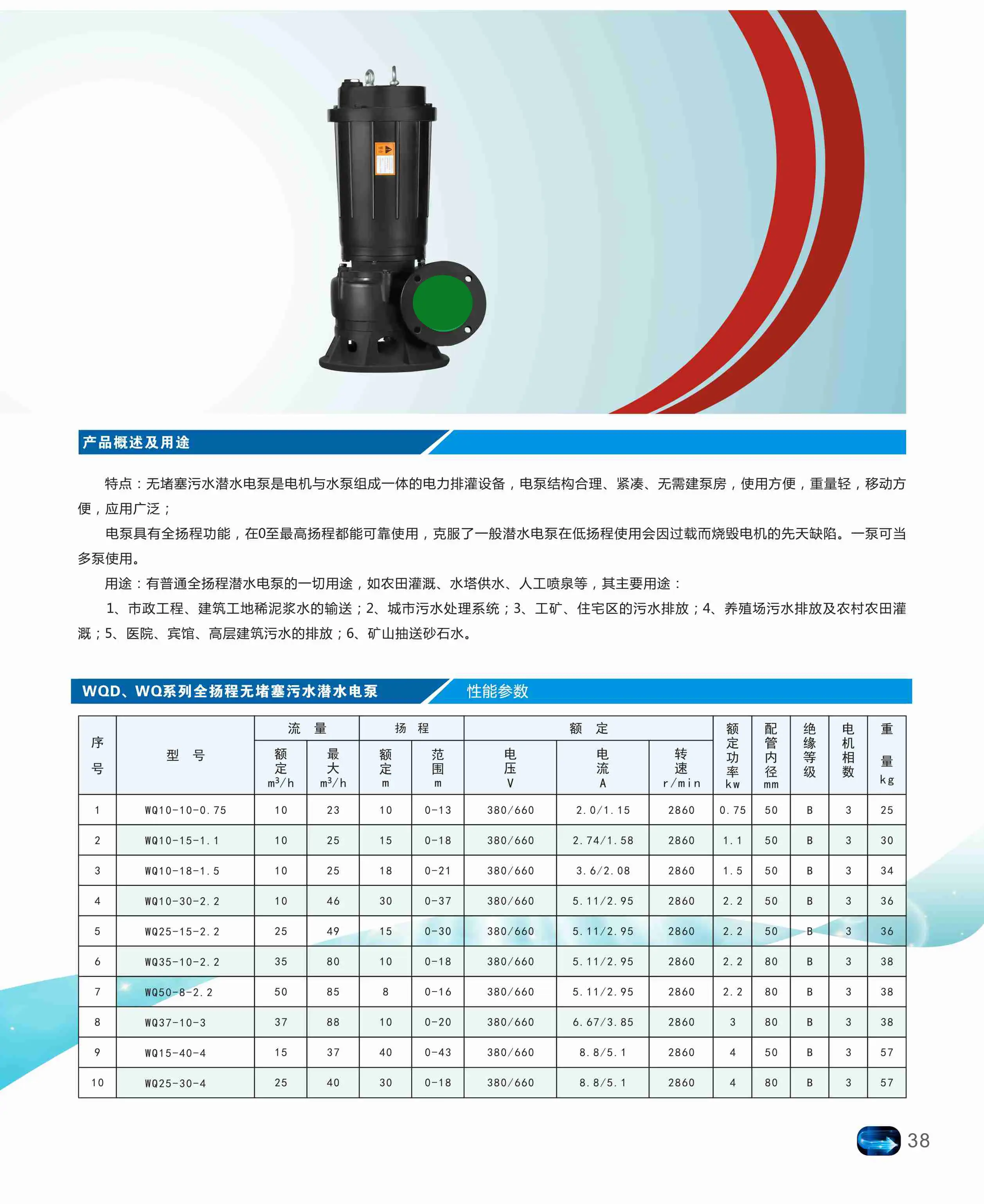 潜水泵是深井提水的重要设备。使用时整个机组潜入水中工作,把地下水提取到地表,是生活用水、矿山抢险、工业冷却、农田灌溉、海水提升、轮船调载,还可用于喷泉景观。